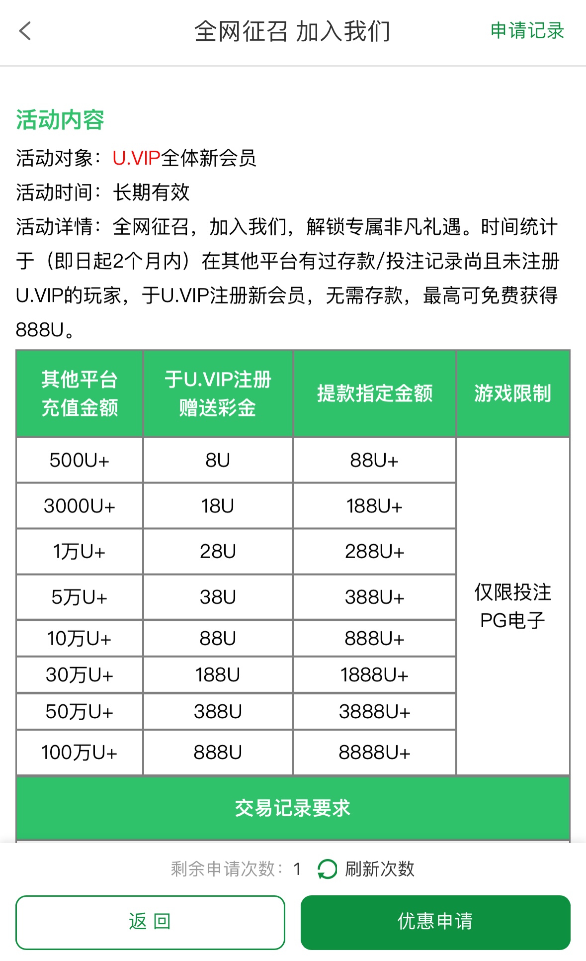 其他台满足要求可以去自助申请试试,要求同步地址需具备至少2笔+成功的汇旺/USDT提款记录,限PG电子