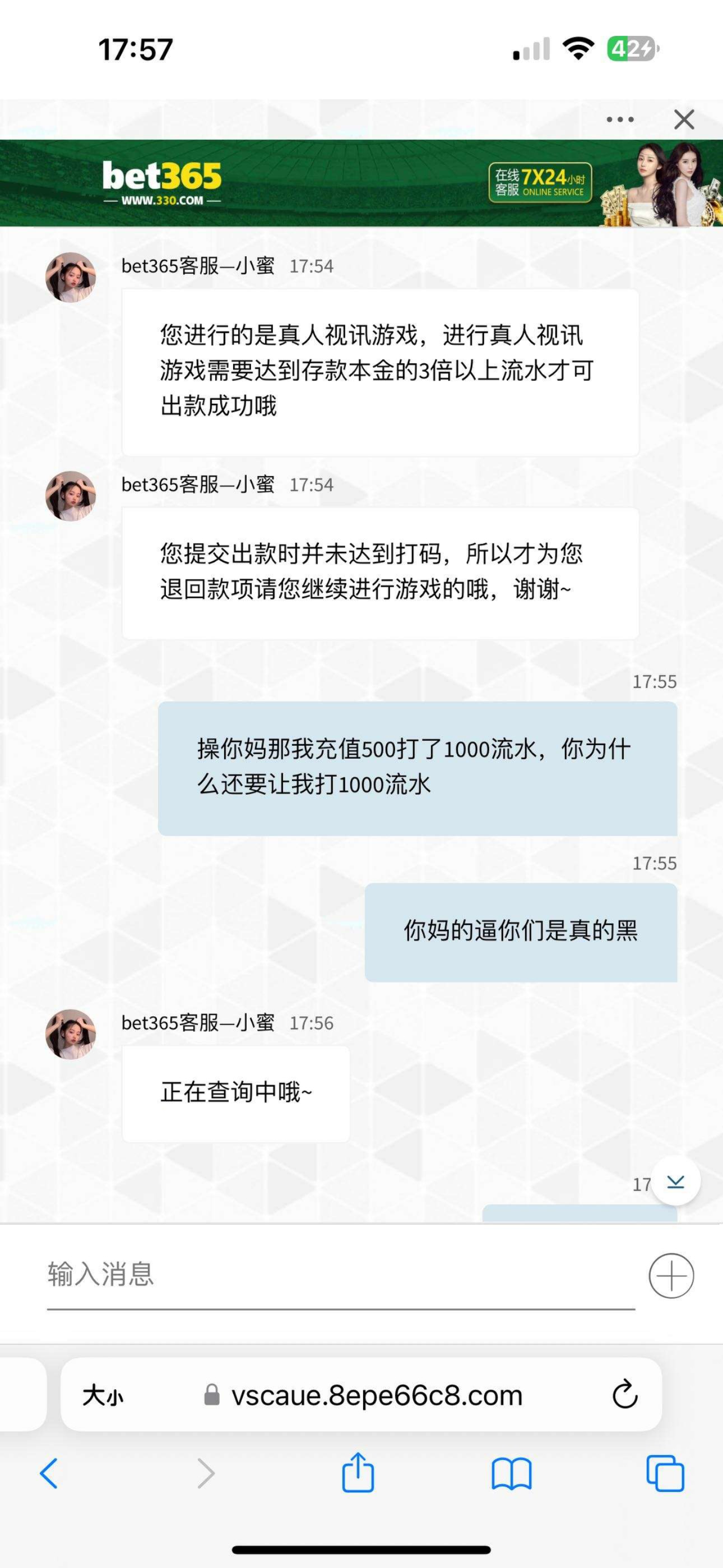 bet330是黑平台,充值500打上1100,拒绝出款让我再打1000块钱流水,后面一直杀,,后面充值了又不让我出款,一直杀我3600,大家千万避雷这个黑平台,充值多少输多少,赢了也不会让你提现。
